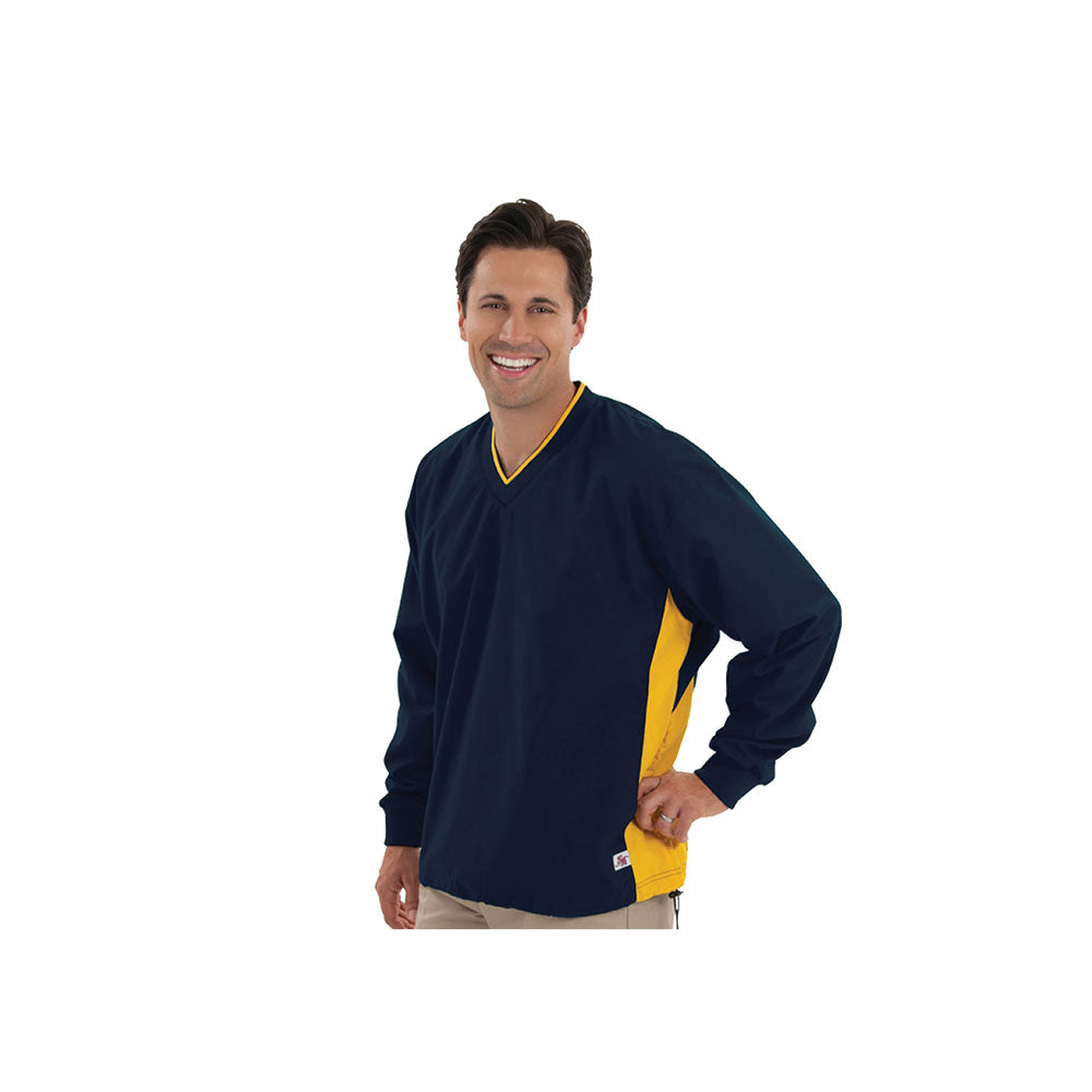 • Rib-knit cuffs and neck, contrasting color for side gussets, back v-notch, and neckline trim.